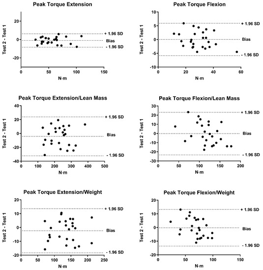 Figure 1 shows Bland–Altman plots peak torque. Bland–Altman plots indicated that none of the points were outside the 95% LOA.