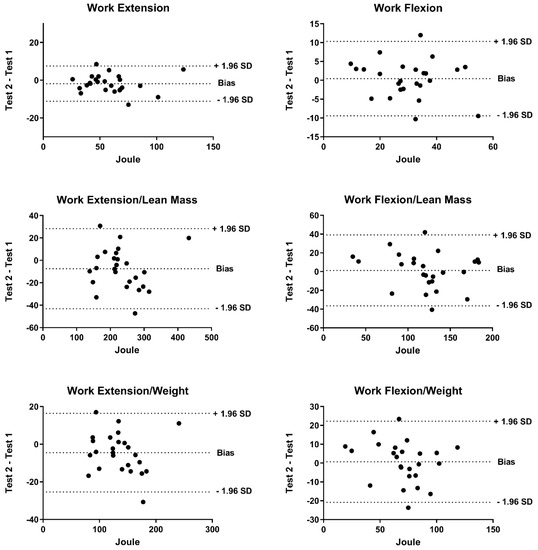 Figure 2 shows the Bland–Altman plots work. Bland–Altman plots indicated that the points outside the 95% LOA were 6% for both extensors and flexors.