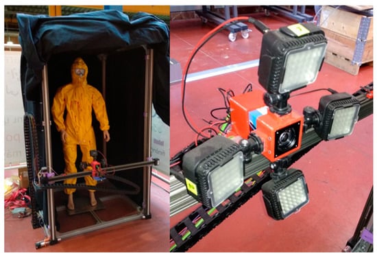 A full-body scanner prototype which resembles the systems used in airports and offices was developed between 2016 and 2019 in the University Carlos III of Madrid. These scanners are designed to detect objects under clothing and not for its surface, so the underlying technology is expensive and generally makes use of X-rays or electromagnetic radiation with complex mechanisms [14]. The HORUS full-body scanner structure was implemented in a cost-efficient way using two motors over a linear plane guidance and a camera with motorized zoom and an illumination system (Figure 1). The choice of this kind of system requires the study and use of image processing algorithms able to provide reliable data for the detection of blood traces. The study of a set of computer vision algorithms was already tested in 2019 and is one of the research areas of the project [15]. Another promising research line brings together the use of an active vision system able to detect and classify defects in PPE and the latest trends in Artificial Intelligence (AI). The current software infrastructure allows to control the robotic system manually or set an automatic scan mode that stores a set of images in predefined positions into disk. A graphical user interface was developed by the members of the project team to provide specific options to set this manual or automatic mode, as well as the possibility to adjust certain image and camera properties.