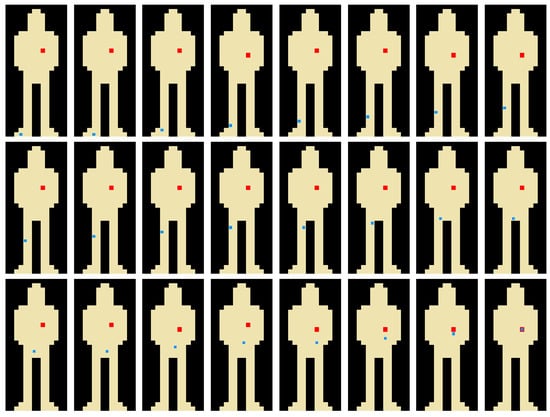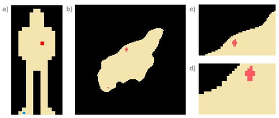 For the training of the RL active vision system, custom synthetic images have been used. This has allowed to perform all computations more efficiently and has simplified the problem to the least complex scenario. Custom images of pixels (Figure 3a) were used for the first problem definition. This set of images shows the whole visual framework of the environment, and they represent: black for the background, yellow for the medical suit and single red and blue pixels for a blood trace and the camera position, respectively. In addition, a visual framework of pixels that represent the environment (Figure 3b), where the camera is able to move and capture a window size of pixels (Figure 3c,d), has been designed. This is required because the real visual system does not allow the visualization of the entire mechanical cubicle. Every synthetic image is represented by three different pixel values identifiable with the three main elements to detect: blood (red), suit (yellow) and background (black).