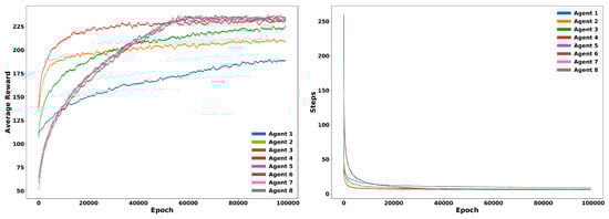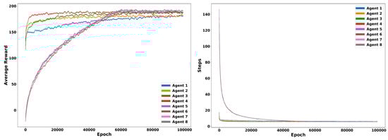 Efficiency was analysed for each of the reward designs and for a group of 8 agents. Figure 6 and Figure 7 show the performance in terms of average reward of these agents. Although, Reward/TimeStep ratio (Table 1 and Table 2) is in general better for Agents 1–4, plotting the results over time show that final reward improves in Agents 5–8 due to the use of an epsilon decaying method to regulate exploration. Exploration is needed because there is always uncertainty about the accuracy of the action-value estimates. From the several simple ways to balancing exploration and exploitation that have been used in this work, it seems that -decay approach achieves better results than the rest. This method reduces the exploration hyperparamer in each iteration, allowing to explore more state-action pairs at the beginning of training and eventually reducing the number of non-greedy movements.