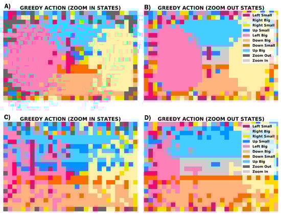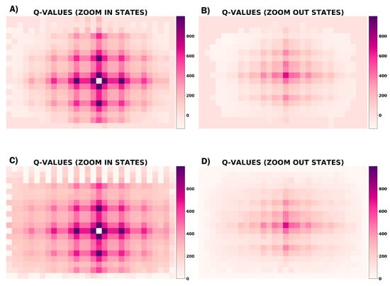 Q-Values of greedy actions for each state in the two possible Zoom configurations after 100,000 training epochs. (A) (ZI) and (B) (ZO) images corresponds to Agent 8 (Reward Shaping I) and (C) (ZI) and (D) (ZO) images are for Agent 8 (Reward Shaping II).