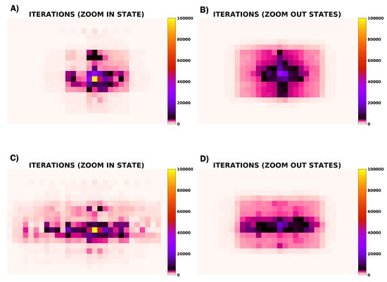 Iteration values representing how many times each state has been visited during 100,000 training epochs. (A) (ZI) and (B) (ZO) images corresponds to Agent 8 (Reward Shaping I) and (C) (ZI) and (D) (ZO) images are for Agent 8 (Reward Shaping II).