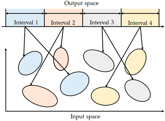 First, the method of dividing the interval without overlapping flexibly adjusts the interval length from the probability distribution of data in the output. The interval of a portion with a large distribution value is short, while that with a small distribution value is long. We define the method of flexible and non-overlapping partitioning as Case 2. Second, the method of dividing the interval evenly and overlapping a certain range is similar to the general method, but the difference lies in overlapping the ends of each interval. This method allows each section to overlap a certain range to find additional similar features. Figure 2 shows a conceptual diagram of Cases 1, 2, and 3 according to the method of interval division. Figure 2a shows Case 1, which divides the output space uniformly, and Figure 2b shows Case 2, which flexibly divides the output space based on a stochastic distribution. The second interval of Figure 2b is observed to be short, because the distribution value is large. Figure 2c shows Case 3, which is divided evenly over a certain range.
