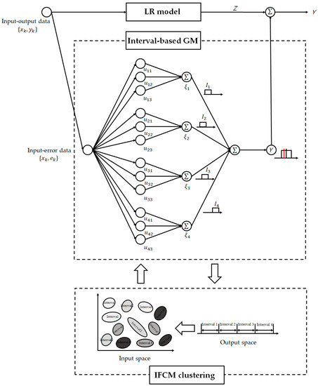 Interval-based GM is designed using the IFCM clustering method, as described in Section 2.2. The interval-based GM modeling of the local part is modeled using input-error data, which combine the input data and the error obtained from the global part, rather than the general input data. When input-error data enter the input of the interval-based GM, the intervals are generated in the output and a cluster corresponding to each interval is generated in the input space. Rules can be created through the intervals and clusters created here. The results obtained for the IFCM clustering method in Layer 3 are combined to generate the interval-based GM output and with the LR model output for calculating the final output of the interval-based IGM. Then, the LR’s error is compensated. Therefore, the model’s performance is enhanced. The procedure of interval-based IGM is described as follows.