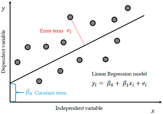 LR refers to modeling a linear correlation between the input variables and output variable. A simple LR is based on an explanatory variable, while multiple LRs are based on two or more explanatory variables. LR is modeled using a linear prediction function, where unknown parameters are estimated from the data. To illustrate, we want to simplify the data comprising two input variables and one output variable. Any input–output dataset is configured in the form of . Here, represents an input variable and represents an output variable. Figure 6 shows the concept of the well-known LR. In Figure 6, the dots represent the data and the lines represent the simple linear regression equation.