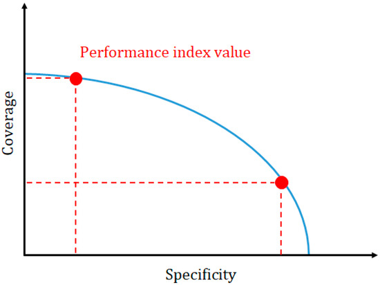 Figure 9 shows the relation between coverage and specificity, where the PI values are found to be curved. The two values have a tradeoff in which the specificity value decreases when the coverage value increases, and vice versa. Therefore, it is important to balance the two values without being biased on either side.