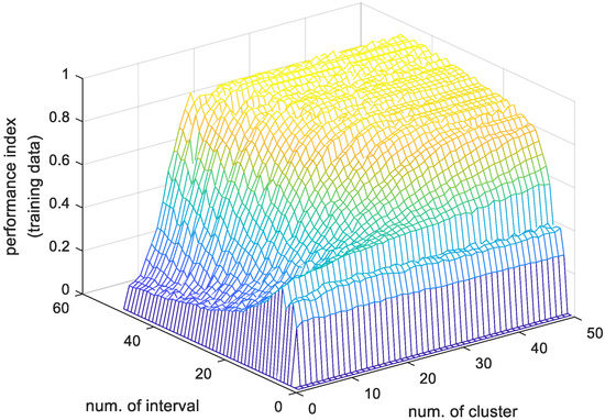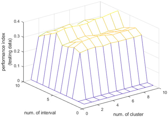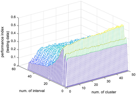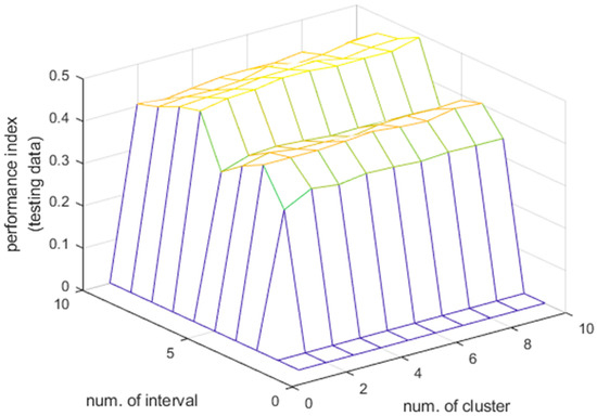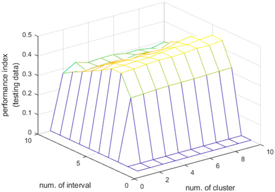 Next, we will look at the overfitting problem in the construction of the interval-based IGM. In the case of the CSS data set, the number of intervals and clusters per interval was increased from 2 to 50, respectively. As a result, it was confirmed that overfitting occurs when the number of intervals is large. Figure 16 and Figure 17 show the variation of performance index as the number of intervals and clusters per interval increase for training and testing data set, respectively. As shown in Figure 17, we found that performance index decreases when the number of intervals is more than 7. As to the number of cluster per interval, the performance index increases slightly. We will study the optimal allocation of clusters for future research.
