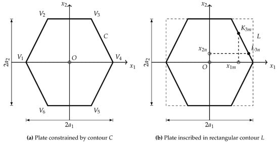 Let us consider thin isotropic symmetrical plate with at least two symmetry axes which has thickness h and surface S. Plate is referred to right-handed Cartesian coordinate system origin at its geometrical center and constrained by contour C (Figure 1a). We assume that it is balanced with outer load applied to surface S and complied with the boundary conditions. Symmetry of the plate geometry, mechanical properties, boundary conditions and outer load are taken into account in this paper. Plate is defined by coordinates of its vertices .