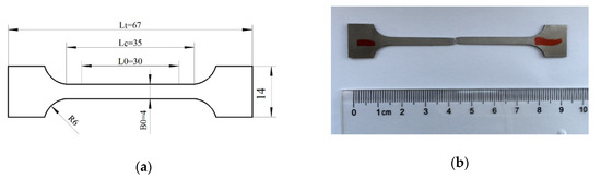 According to GB/T 228.1-2010, the superalloy GH1140 sheet with thickness of 2 mm should be cut to get the sample [20]. The sample structure before and after the experiment is shown in Figure 1. Five groups of tensile tests with the conditions of 3 mm/min moving speed and 20 °C normal temperature were carried out on the MTS600 tensile sample machine (Jinan MTS Testing Technology Co., Ltd, Jinan, China). The nominal stress–strain curve is obtained, as shown in Figure 2.