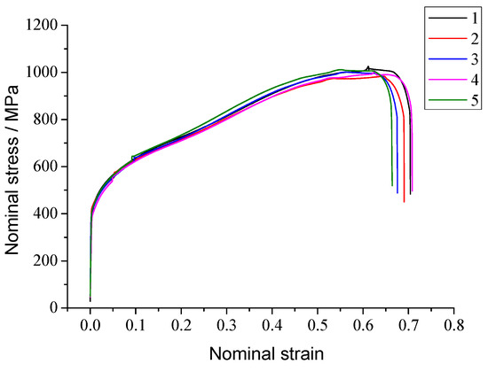 Based on the above formulas, the true stress–strain curve of the sample can be obtained by integrating the five samples′ nominal stress–strain curves, as shown in Figure 3.