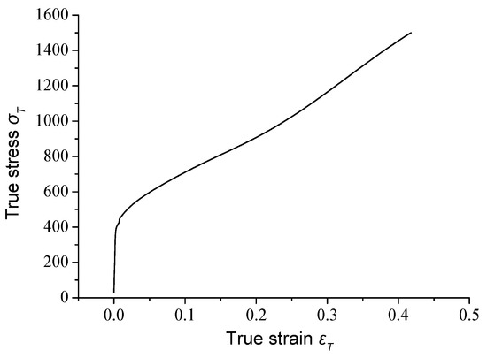 The premise of the plastic forming problem is described with the plastic condition and constitutive equations. The functional relationship of these two equations is related to the shape and material properties of the workpiece, but is independent of the stress state [19]. The true stress–strain curve of the superalloy GH1140 is established by the uniaxial uniform tensile test method.