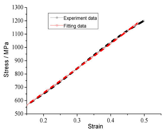 The comparison between the fitting curve and the true stress–strain curve is shown in Figure 4. The fitting accuracy is high, which verifies the correctness of the model in this paper.