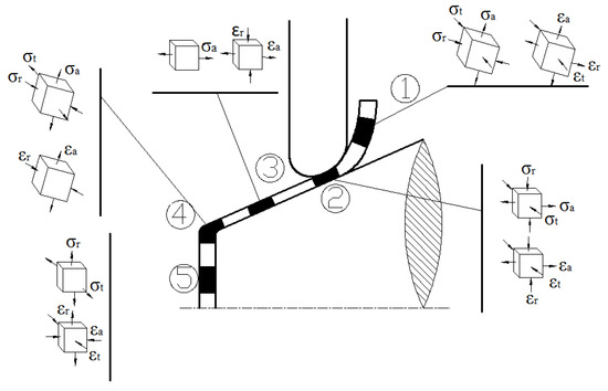 When the external load during the metal spinning deformation is different, the stress state is different, so the plasticity also varies. The sheet metal is discretized and divided into independent blocks. The stress state of each block is expressed by three principle stresses. The direction and nature of the principle stress varies with the force. The mechanical model of shear spinning is shown in Figure 5.