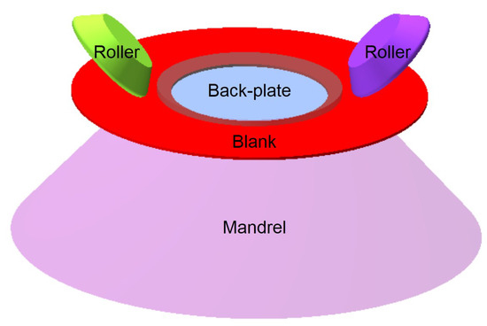 As shown in Figure 6, the FE simulation model of the thin-walled conical part with variable-section during spinning is established by Unigraphics NX, which includes roller, blank, mandrel and back-plate. Unigraphics NX software is a flexible and powerful integrated solution that delivers the next generation of design, simulation, and manufacturing solutions. The blank is fixed on the top of the mandrel by the back-plate, while the mandrel and back-plate are rotated at a fixed speed; they drive the blank to rotate at the same time. The rollers on both sides are fed according to the preset track, driven passively by the blank, and they apply pressure to the blank. The FE model in STL format was imported into Simufact.Forming, which is an advanced material processing and heat treatment process simulation optimization software. The blank selected in this paper is a circular sheet with a thickness of 2 mm and a diameter of 250 mm. The material in the top area of the blank does not participate in the deformation process, so the model of the blank is simplified as a circular blank with a hole in the center of the top. The volume of the blank becomes smaller, and the number of meshes is reduced, thus shortening the simulation time. The material of the blank used in the simulation is superalloy GH1140. It is defined as elastoplastic and it is divided by a Hexahedral mesh cell. The mandrel, roller and back-plate are both considered as rigid. In order to reduce unnecessary simulation time, the friction heat generated between the roller and blank during the forming process is neglected. The ambient temperature, blank temperature and mandrel temperature are set to 25 °C. The relative parameters of the simulation are as follows: the rotary speed is 250 r/min, the feed speed is 1.0mm/r, the friction coefficient is 0.5 and the gap deviation rate is 5%.
