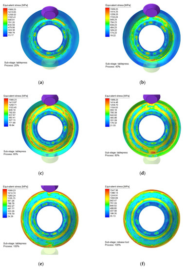 Equivalent stress distribution of the outer surface in each forming stage: (a) 20% forming process; (b) 40% forming process; (c) 60% forming process; (d) 80% forming process; (e) 100% forming process; and (f) after the roller unloading.