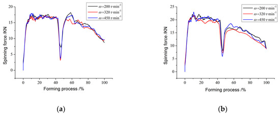 The effect of the mandrel rotational speed on the spinning force is shown in Figure 8. When the spindle speed is increased under the condition of constant feed ratio, the spinning force is basically stable because the volume of materials involved in deformation does not change during the same deformation time. The overall spinning force is basically unchanged with the increase of the roller rotational speed when the roller feed ratio is 0.6, 1.0 and 1.4, but the fluctuation of the spinning force is different.
