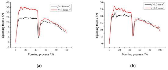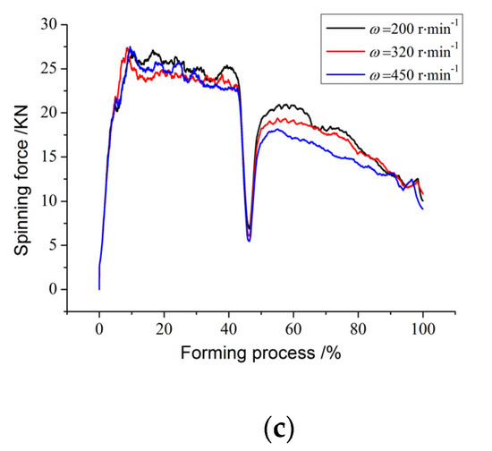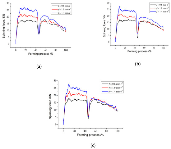 The effect of the roller feed ratio on the spinning force is shown in Figure 9. Under the condition of constant mandrel rotational speed, increasing the roller feed ratio will lead to an increase of the strain rate and the amount of metal formed in the same time, so the spinning force also increases. This is because the mechanism of plastic deformation is complicated; it requires a certain amount of time to complete. The effect of the roller feed ratio f is highly significant when considering the influence of the single factor variation on the spinning force maximum.