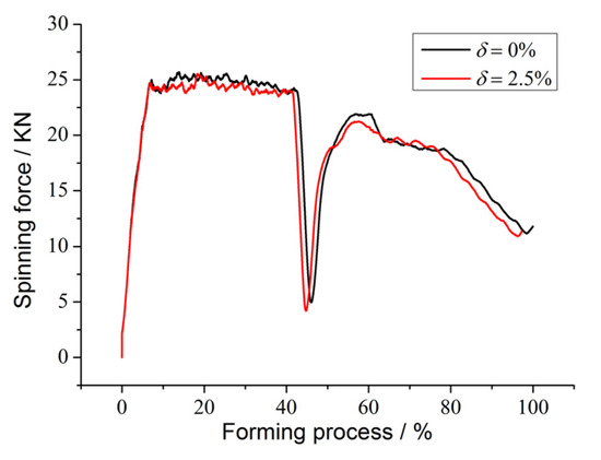As shown in Figure 11, under the same mandrel rotational speed and roller feed ratio, with an increase of the clearance deviation rate, the spinning force does not change as a whole. When the gap deviation rate is positive, the deformation state of the material is the combination of shear and tension. The formed part is not well molded, and local thinning is prone to occur under tensile stress. At a zero gap deviation rate, the deformation of the material is pure shear, which is the most stable deformation process.