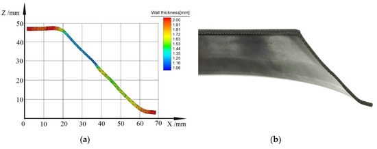 In order to validate the computer simulation, the experimental part cut along the thickness direction is compared with the simulation cross-sectional view, as shown in Figure 13. The die-attachment effect is better at the beginning of the deformation. It verifies the reliability of the spinning finite element model.