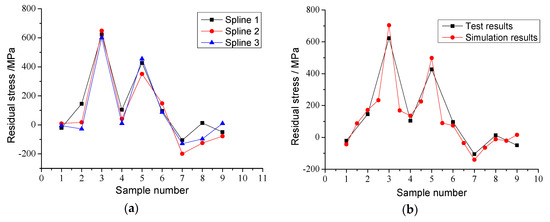 Comparison of residual stress measured by experiment and simulation: (a) residual stress of three splines; (b) residual stress between the test results and the simulation results.