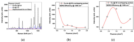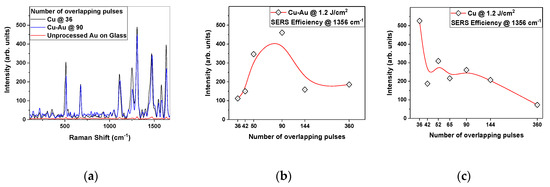 - Byram, C.; Moram, S.S.B.; Soma, V.R. Surface-enhanced Raman scattering studies of gold-coated ripple-like nanostructures on iron substrate achieved by femtosecond laser irradiation in water. J. Raman Spectrosc. 2019, 50, 1103–1113. [Google Scholar] [CrossRef]