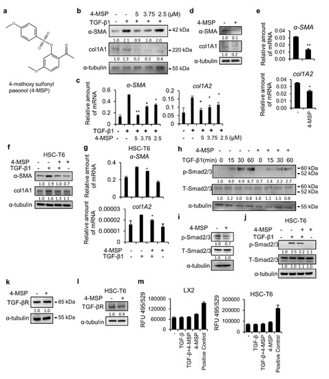 Compound 4-MSP inhibits TGF-β1-induced hepatic stellate cells (HSCs) activation. (a) Structure of 4-methoxy sulfonyl paeonol (4-MSP). (b) LX2 cells were treated with TGF-β1 (10 ng/mL) and 4-MSP for 24 h. Western blot analyzed the protein levels of α-SMA, col1A1, and α-tubulin. (c) Real-time PCR detected mRNA levels of α-SMA and col1A2 relative to that of GAPDH. *: p < 0.05 vs. TGF-β1 alone group; **: p < 0.01 vs. TGF-β1 alone group. (d) LX2 cells were treated with 4-MSP for 24 h. Western blot analyzed the protein levels of α-SMA, col1A1, and α-tubulin. (e) Real-time RT-PCR detected mRNA levels of α-SMA and col1A2 relative to that of GAPDH. *: p < 0.05 vs. control group; **: p < 0.01 vs. control group. (f) HSC-T6 cells were treated with TGF-β1 (10 ng/mL) and 4-MSP for 24 h. Western blot analyzed the protein levels of α-SMA, col1A1, and α-tubulin. (g) Real-time RT-PCR detected mRNA levels of α-SMA and col1A2 relative to that of GAPDH. *: p < 0.05 vs. TGF-β1 alone group. (h) Pre-treated LX2 cells with 5 µM of 4-MSP overnight and then subjected to TGF-β1 (10 ng/mL) for indicated times. Phosphorylation- and total-Smad2/3 were analyzed by western blot. (i) LX2 cells were treated with 4-MSP for 24 h. Phosphorylation- and total-Smad2/3 were analyzed by western blot. (j) Pre-treated HSC-T6 cells with 5 µM of 4-MSP overnight and then subjected to TGF-β1 (10 ng/mL) for 30 min. Phosphor- and total-Smad2/3 were analyzed by western blot. (k) LX2 cells were treated with 4-MSP for 24 h. Western blot analyzed the protein levels of TGF-βR and α-tubulin. (l) HSC-T6 cells were treated with 4-MSP for 24 h. Western blot analyzed the protein levels of TGF-βR and α-tubulin. (m) Cellular reactive oxygen species (ROS) levels were performed by using the commercial ROS detection assay kit, according to the manufacturer’s instructions. Data are presented for three independent experiments, with similar results.