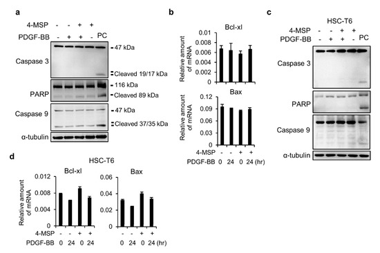 Compound 4-MSP treatment did not induce apoptosis in HSCs. Treatment of LX2 and HSC-T6 cells with PDGF-BB (10 ng/mL) and 4-MSP (5 µM) for 24 h. (a,c) Protein levels of Caspase-9, PARP cleavage, and α-tubulin were analyzed by western blotting. PC: positive control. (b,d) mRNA levels of Bcl-xl and Bax, relative to that of GAPDH, were measured by real-time RT-PCR. Data shown are at least three independent experiments with similar results.