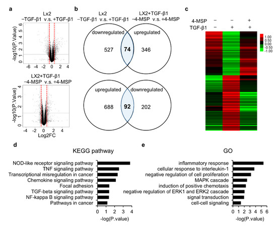 Gene expression profile of TGF-β1 and 4-MSP-treated LX2 cells. (a) The volcano plot shows the distribution of differentially expressed genes according to 1.5-fold change (red axis). (b) The Venn diagrams show the correlations for up- and downregulated genes between LX2 ± TGF-β1 and LX2+ TGF-β1 ± 4-MSP. (c) The heat map of 166 4-MSP-affected genes, based on mRNA microarray analysis. Red and green represent the increase and the decrease in the gene expression levels, respectively. (d,e) Kyoto Encyclopedia of Genes and Genomes (KEGG) pathway and Gene Ontology (GO) term enrichment analysis for 166 4-MSP-affected genes.