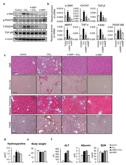 Mice treated with compound 4-MSP attenuate CCl4-induced liver damage and fibrosis. (a) Hepatic protein levels of α-SMA, T/P-PDGFR, TGF-βR, and α-tubulin from four groups were analyzed by western blot. (b) mRNA levels of α-SMA, col1A2, TGF-β, MMP2, TNF-α, and F4/80 relative to that of GAPDH (n = 6 per group) were measured by RT-PCR. Data are expressed as the mean ± SD. *: p < 0.05 vs. CCl4 alone group; **: p < 0.01 vs. CCl4 alone group. (c) Representative images of H&E, Sirius Red, Masson’s Trichrome stainings, and F4/80 immunohistochemical (IHC) staining of liver tissues from each treatment group. The black bar represents a length of 0.1 mm. (d) Liver hydroxyproline quantification was performed, according to the manufacturer’s instruction. (e) Mean body weight of individual mouse group at the endpoint of the experiment. (f) Serum samples were acquired at the endpoint of the experiment, and the BUN, albumin, and ALT values were assessed.