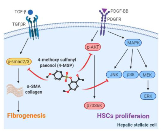 Proposed model of compound 4-methoxy sulfonyl paeonol (4-MSP) in the inhibition of HSCs proliferation and fibrogenesis. Compound 4-MSP causes inhibition of hepatic stellate cells (HSCs) activation and liver fibrosis by blocking TGF-β1/Smad, PDGF-BB/MAPK, and Akt signaling pathways.
