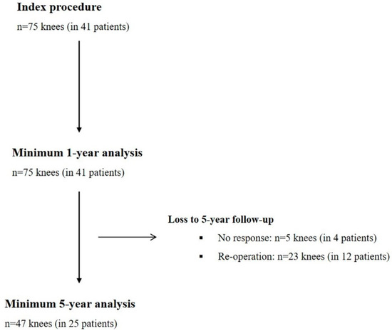 In total, 41 patients (75 knees) with knee OA received an intra-articular BMAC injection into the knee. During the 5-year follow-up, four patients (5 knees) dropped out, and patients who underwent a secondary operation were also excluded to eliminate bias. Finally, the remaining 25 patients (47 knees) were investigated in the present study (Figure 1).