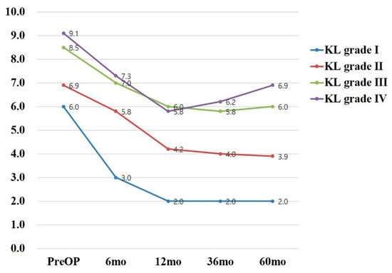 The mean VAS score improved over time, with scores decreasing from 6 months (8.3 ± 1.2) to 5 years (4.7 ± 0.5) postoperatively (p < 0.001). The most significant improvement was observed in the first 6 months (Post hoc analysis, p < 0.001). Based on the severity of the arthritis, the pain improvement was significantly different according to the K-L grades. Patients with knee OA of K-L Grades III and IV had lower pain improvement than those with knee OA of K-L Grades I and II during the follow-up period (ANOVA, p < 0.01, Figure 2).