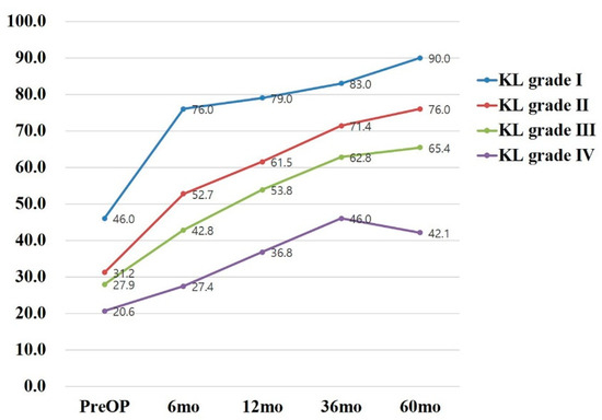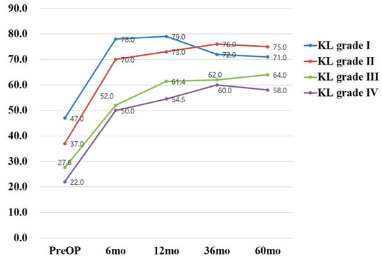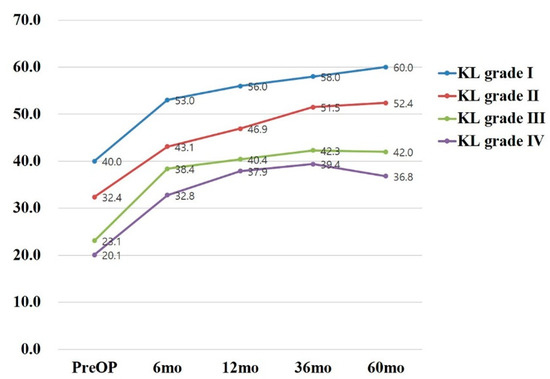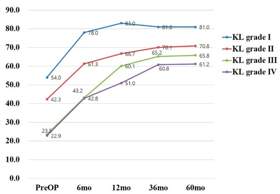 The mean SF-36 score also improved from 26.8 ± 4.3 preoperatively to 48.2 ± 6.0 at the 5-year follow-up (p < 0.001). However, this improvement did not significantly differ in terms of age and sex. The severity of OA was significantly associated with the outcomes of the SF-36; the improvement in patients with knee OA of K-L Grade I, II, and III was significantly greater than that in patients with K-L Grade IV (ANOVA, p = 0.02, Figure 4).