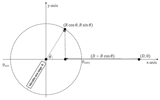 In order to derive the delivery speed for every member in a mobile sink group, we consider the maximum (farthest) distance in the movable area. In the area, as the farthest point from the entry point might be located on the ring, we calculate the distance between two points on the ring. In Figure 2, we assume that the center point and the source node are on the coordinate (0,0) and (D,0), respectively. Each point on the circle can be represented with the angle : (R, R). The distance to each point is presented as follows.
