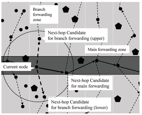 Each branch forwarding is repeated in every radio-range. For each branch forwarding, multiple branch zones are virtually constructed. The reason to construct the branch zone is to reduce energy consumption by allowing only a flow of data in a zone and avoiding every node participating in communication. There are branching points in the main forwarding in a movable zone, where the radius is R and the radio range of the sensor nodes is r. The branching point set is represented as follows.