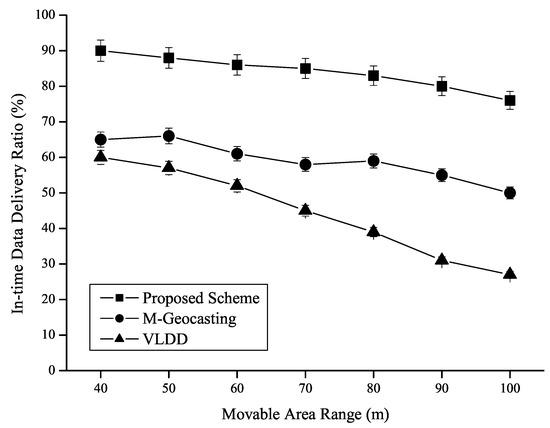 In Figure 7, the in-time data delivery ratio is presented according to the movable area range of a mobile sink group. In M-Geocasting, as the movable area spans, a larger number of sensor nodes should participate in communication and the interference is more frequently occurred. When the range of the area is 70 m, in M-Geocasting, approximately 61 sensor nodes participate in its flooding area; however, there are only about 39 participating nodes in our scheme. In VLDD, as the area is wider, it might have a lower possibility to receive an in-time data packet due to its passive data forwarding. With the performance of the proposed scheme, we show that our proposed scheme could cover the wider movable area by multiple unicast forwarding.
