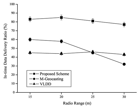 Figure 8 shows that the in-time data delivery ratio is affected by the radio range of the sensor node. We vary the range from 15 m to 30 m. Our mechanism and VLDD show almost constant performance, although the range is varied. It is because that our mechanism and VLDD do not exploit the flooding. In M-Geocasting, as the range is wider, the number of one-hop neighbor nodes is increased. With the larger number of neighbor nodes, the number of branches in flooding is increased; however, the possibility of interference for each neighbors also increases dramatically. Therefore, the performance of data delivery ratio is rapidly degraded.