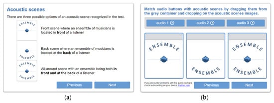 Graphical user interface exploited in the developed web application: (a) excerpt from the instructions for the listeners; (b) interface used for spatial audio scene classification.