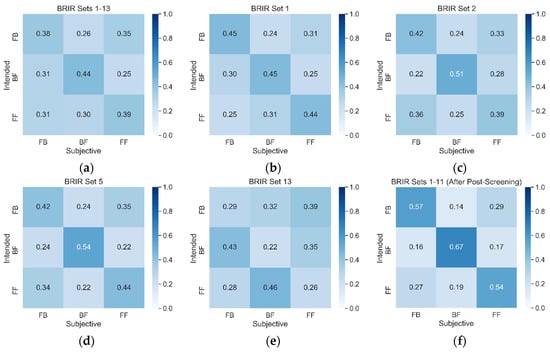 The confusion matrix obtained for the raw data is shown in Figure 2a. It confirms the erratic nature of the results, with the accuracy levels along a diagonal axis only slightly exceeding the no-information rate. Confusion matrices obtained for the stimuli synthesized using individual BRIR sets are quantitatively similar to the above one. Therefore, for clarity, the confusion matrices for only three selected BRIR sets (1, 2, and 5) are presented in panels b-d of that figure. In contrast to the above results, the confusion matrix obtained for BRIR set 13 appeared to be slightly different. This is presented in panel e. Visual inspection of that matrix indicates that the listeners tended to misclassify BF scenes as FB and FF scenes as BF. This unusual effect was also confirmed later in the statistical post-hoc test accompanying the analysis of variance (see below).