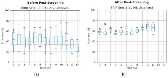 Boxplots of the accuracy scores for stimuli synthesized using specific BRIR sets: (a) before post-screening; (b) after post-screening. Red line denotes no-information rate.
