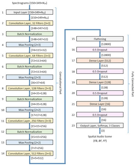 The image resolution of the spectrograms was equal to 150 × 349 pixels (number of frequency-bands × number of time-frames). The spectrograms were combined into three-dimensional tensors and then fed to the network input. The size of each tensor was equal to 150 × 349 × Nch, where Nch represented the number of channels retained in a tensor. In this study, the number of channels Nch was equal to four, since each binaural recording was represented by four spectrograms.