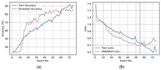 The two-dimensional spectrograms were converted into vectors in layer 15 and subsequently processed by the full connected dense layers consisting of 512, 128, and 16 nodes, respectively. Four dropout layers, with the dropout rate being equal to 0.5, were employed to prevent the network from overfitting (layers 16, 18, 20, and 22). The last layer was responsible for providing the results of the classification. A rectified linear unit was used in all the convolutional and dense layers, whereas a Softmax function was incorporated in the output layer.