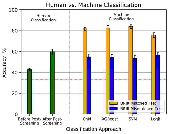 Each listener was requested to classify 30 binaural music excerpts, randomly drawn from the repository of 1560 recordings. In total, 1560 binaural excerpts were classified by the listeners. The same task was also undertaken automatically, exploiting four machine learning algorithms—convolutional neural network (CNN), support vector machines (SVM), extreme gradient boosting framework (XGBoost), and logistic regression (Logit)—allowing for a comparison of the classification accuracy reached by the human listeners with those obtained using the machine audition algorithms. To the best of the authors’ knowledge, this is the first study aiming to undertake such a comparison.