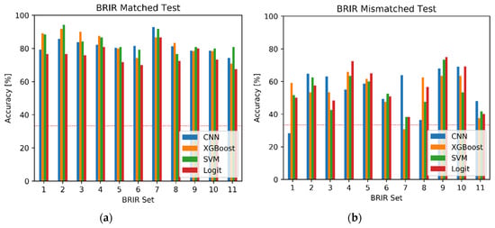 The exact reason for the outlying characteristics of the data obtained using a BRIR set 13 is unknown. The above BRIR set was acquired in the Audio Laboratory at the University of Rostock, which was also the case for a BRIR set 12 (see Table 2). However, in the latter case, the results are not as outlying as the ones obtained using BRIR 13. Nevertheless, after excluding the outlying BRIR set 13, the results obtained using a BRIR set 12 are the worst of all the BRIR sets, with the mean accuracy of 33.96%, being almost equal to the no-information rate.