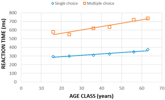 Consistently, we refer to experimental data available in [54]. Here, an extended research on subjects differently aged (900 subjects from 16 to 63 years old), based on the UK’s Health and Lifestyle Survey (HALS) [64]. The experiments consisted of identifying single or multiple right choice out of several possible options. In this paper, data have been used to find correlations between age and reaction time in an information-theory perspective.