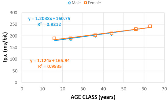As shown in Figure 3, a linear trend (R2 > 0.9) of Tp,c vs. age is observed for male and female; for each age class, sex slightly affects processing time.