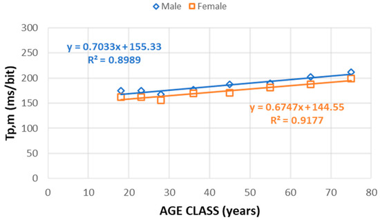 As in the case of cognitive task, linear trends are observed (Figure 4), with large R2 values for both male and female (~0.9) and small differences (~6.5%) in the Tp,m values between male and female for each age class.