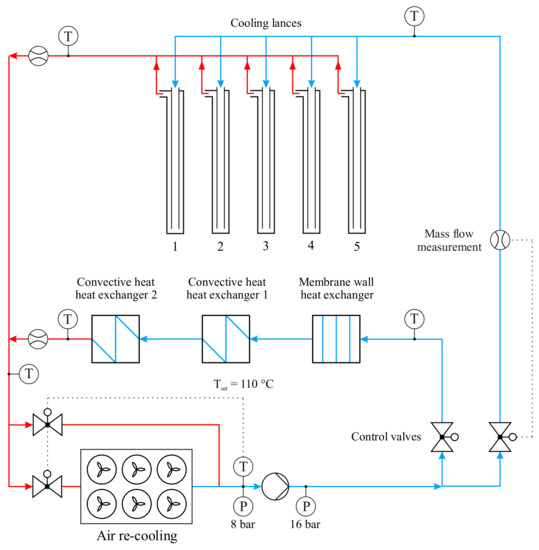 The cooling system is modeled according to the design of the cooling system in the experiment, see Figure 2 and Table 2. However, some components such as the air re-cooling unit are not implemented in the model. Instead, fresh cooling water enters the system with 110 °C and 11 bar (data taken from the experiment). The cold water is pumped to a distributor pipe before it enters the cooling lances and the flue gas cooler. The mass flow through each cooling subsystem is controlled to a certain set point by control valves, while a speed-controlled pump ensures the overall mass flow. In the model, after leaving the subsystems, the hot water is discarded. Three cooling lances are in contact with the calculation nodes 6–20 (corresponds to 6.5 m immersion depth) and two lances are in contact with the nodes 11–20 (corresponds to 4.5 m immersion depth).