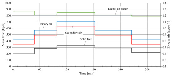 To evaluate the long-term steady-state behavior of the fuel, a 57-h test was carried out at the beginning of the test series with a thermal load of 845 kWth. Short-term fluctuations of the fuel mass flow rate and composition are compensated in such a long period, making this test point very suitable for tuning and validation of process simulations. After the steady-state test, load change tests were carried out to evaluate the dynamic behavior and the hydrodynamic conditions at low loads. Firstly, the load was slowly reduced to 648 kW. After a stabilization time, the load was increased stepwise to 914 kW and 1032 kW. The thermal load depends on the speed of the conveying screw of the fuel, but also on changing properties of the fuel such as bulk density, moisture content, particle size, and chemical composition. To keep the excess-air factor nearly constant, the air mass flow rates were increased to the desired set point and only the fuel mass flow rate was controlled to keep an oxygen excess of around 4–6 Vol-%wet. With the same approach, two load decreasing steps from 1032 kW to 921 kW and 699 kW were performed. After each load change, the pilot was operated in the same conditions for at least 50 min before the next load step was carried out. The large thermal inertia of the bed material acts as a buffer after a load change. Therefore, the stabilization time of ~50 min is not long enough to achieve steady-state conditions for each part-load test. However, the fluctuating behavior of wind and solar power requires quick and flexible load changes by power plants. In the energy market nowadays, it is necessary to perform load changes, when steady-state conditions are not achieved. The target of the experiments was to represent this behavior. Table 5 presents the conditions of the long-term steady-state test and the part-load tests. The experimental approach for the load changes is illustrated in Figure 3. As mentioned, the mass flow of the solid fuel fluctuates strongly, so that the figure only illustrates the average mass flow/setpoint and not the actual one. For the evaluation of the tests, mean values are calculated for the temperature, pressure, and other measured parameters for each part-load test. This evaluation period starts 15 min after each load change and ends 5 min before the next load change.